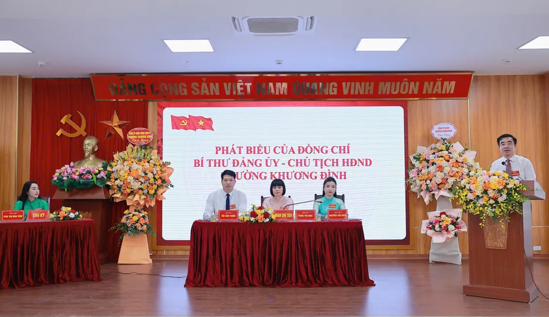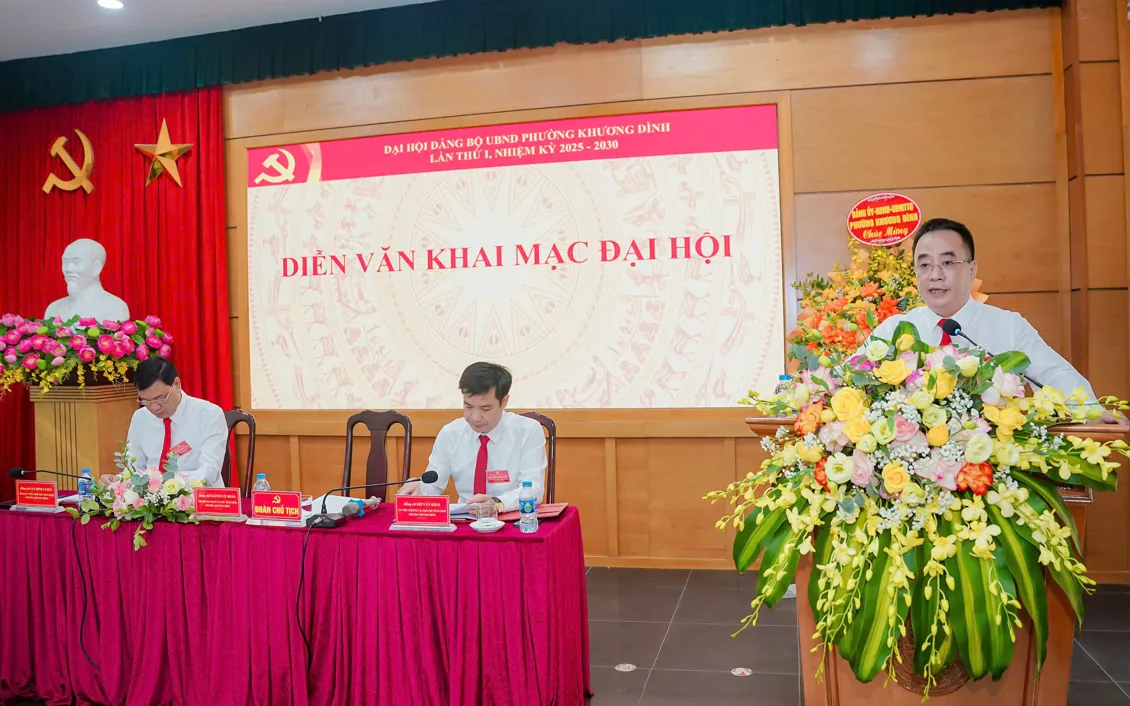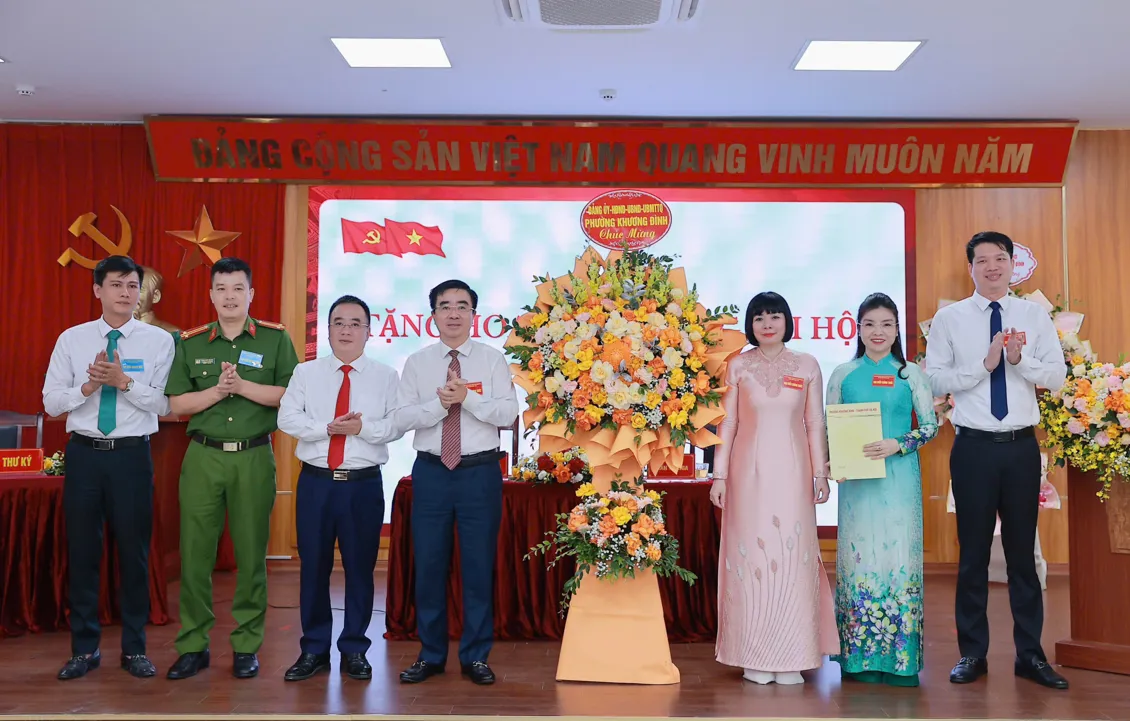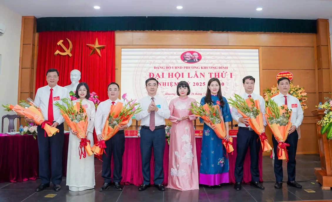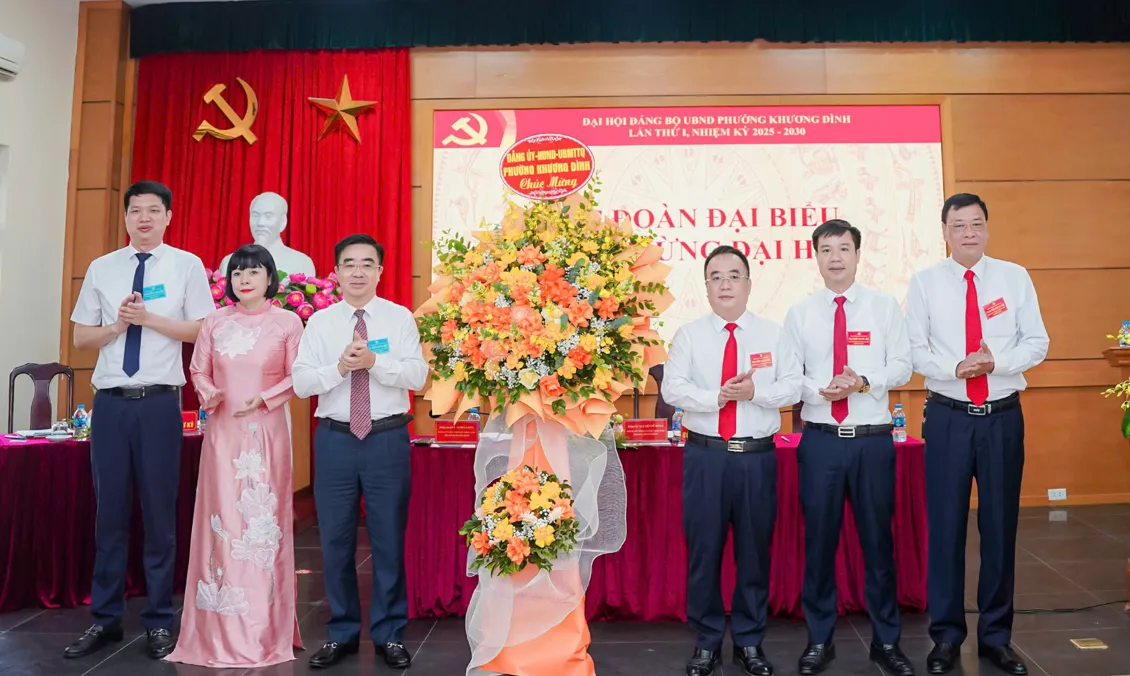 Bí thư Đảng ủy, Chủ tịch HĐND phường Khương Đình Võ Đăng Dũng và Phó Bí thư Thường trực Đảng ủy phường Khương Đình Trần Thị Nga tặng hoa chúc mừng Ban Chấp hành Đảng bộ UBND phườngTrong không khí dân chủ và thống nhất cao, Đại hội đã thông qua Nghị quyết thành lập Đảng bộ UBND phường Khương Đình; ra mắt Ban Chấp hành khóa I, nhiệm kỳ 2025-2030 và biểu quyết giới thiệu 4 đại biểu chính thức, 1 đại biểu dự khuyết dự Đại hội Đảng bộ phường Khương Đình lần thứ I.